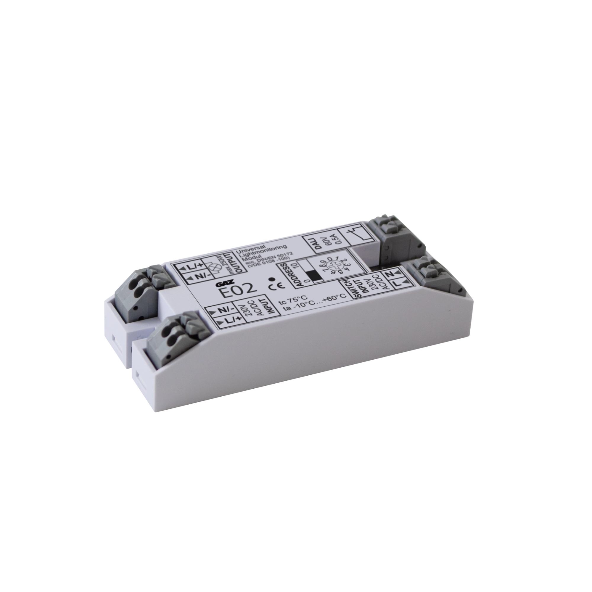 Der Überwachungsbaustein E02 dient der Realisierung des Mischbetriebs und der Einzelleuchtenüberwachung, sowie dem Ein- und Ausschalten einer Leuchte in Verbindung mit Notlichtgeräten der S-Serie. Leitungen für DALI werden im Notlichtbetrieb unterbrochen und Bereitschaftsleuchten auf dem DALI-EVG eingestellten Notlichtlevel eingeschaltet.
