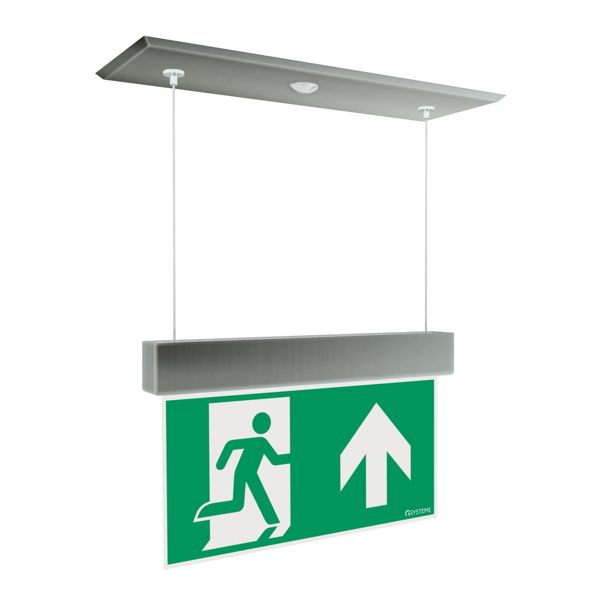 Die integrierte Seilabhängung ist standardmäßig mit einer Länge von etwa einem Meter ausgeführt und ermöglicht eine frei sichtbare Positionierung der Leuchte im Raum. Durch die definierte Montageart entsteht eine klare Installationslogik, die sich in Sicherheitsbeleuchtungsprojekte mit Zentralbatterieversorgung integrieren lässt.