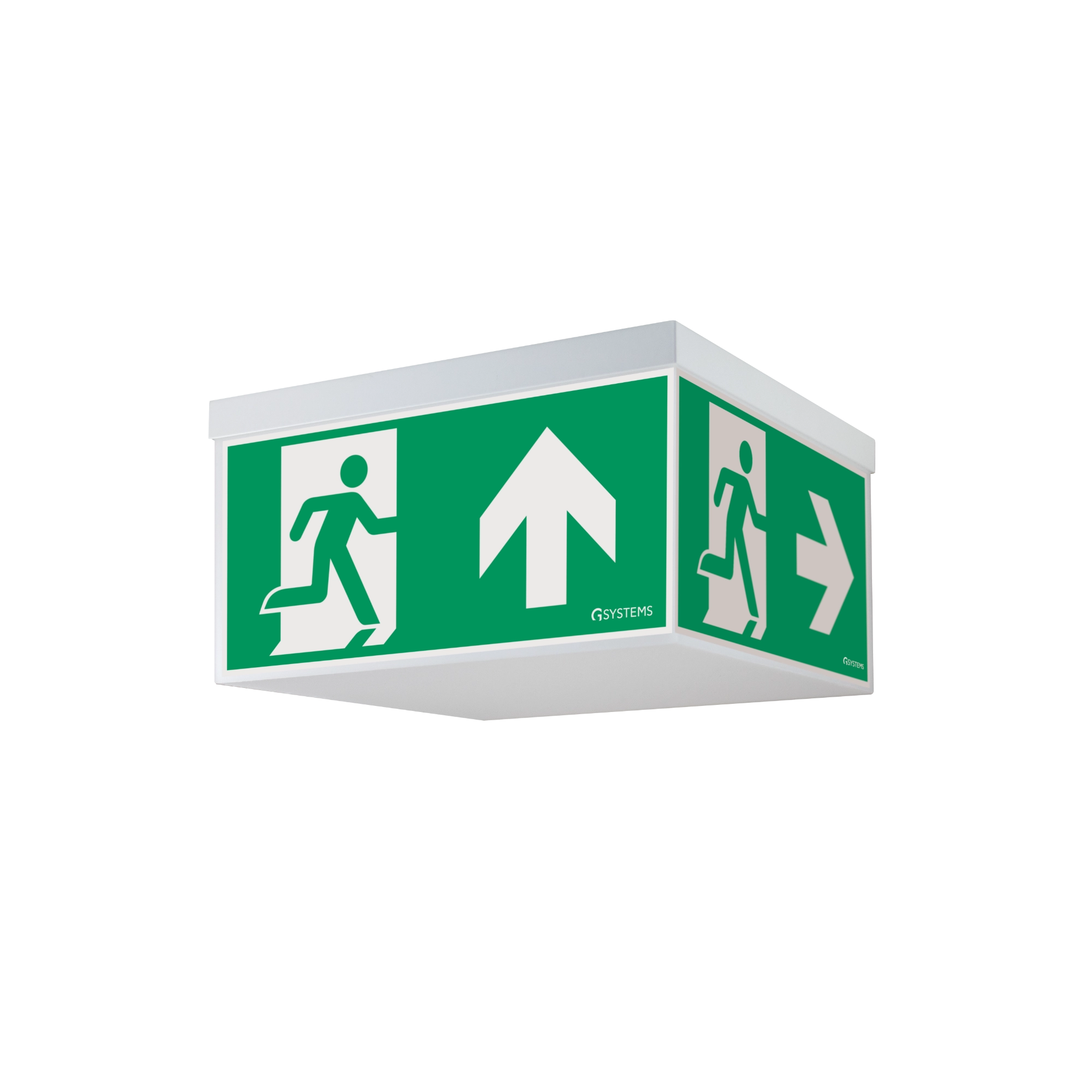 Die frei im Raum positionierte Montage ermöglicht eine klare Rettungswegkennzeichnung auch dort, wo Wandmontage nicht möglich oder nicht sinnvoll ist. Gleichzeitig sorgt die klare geometrische Bauform dafür, dass sich die Leuchte unauffällig in unterschiedliche architektonische Konzepte integrieren lässt.