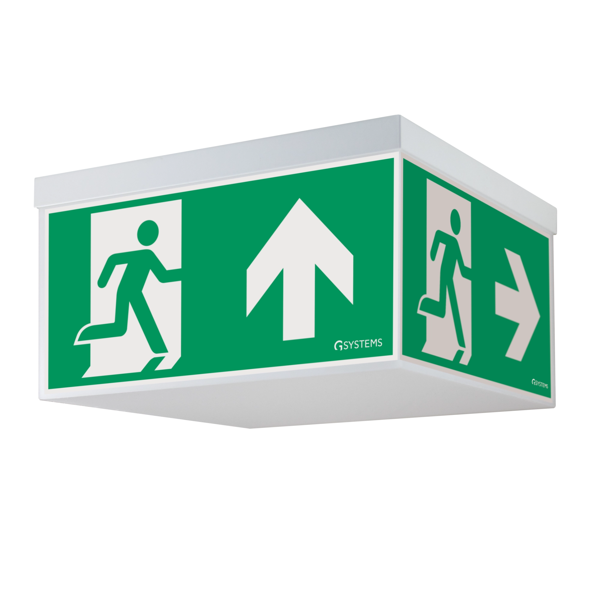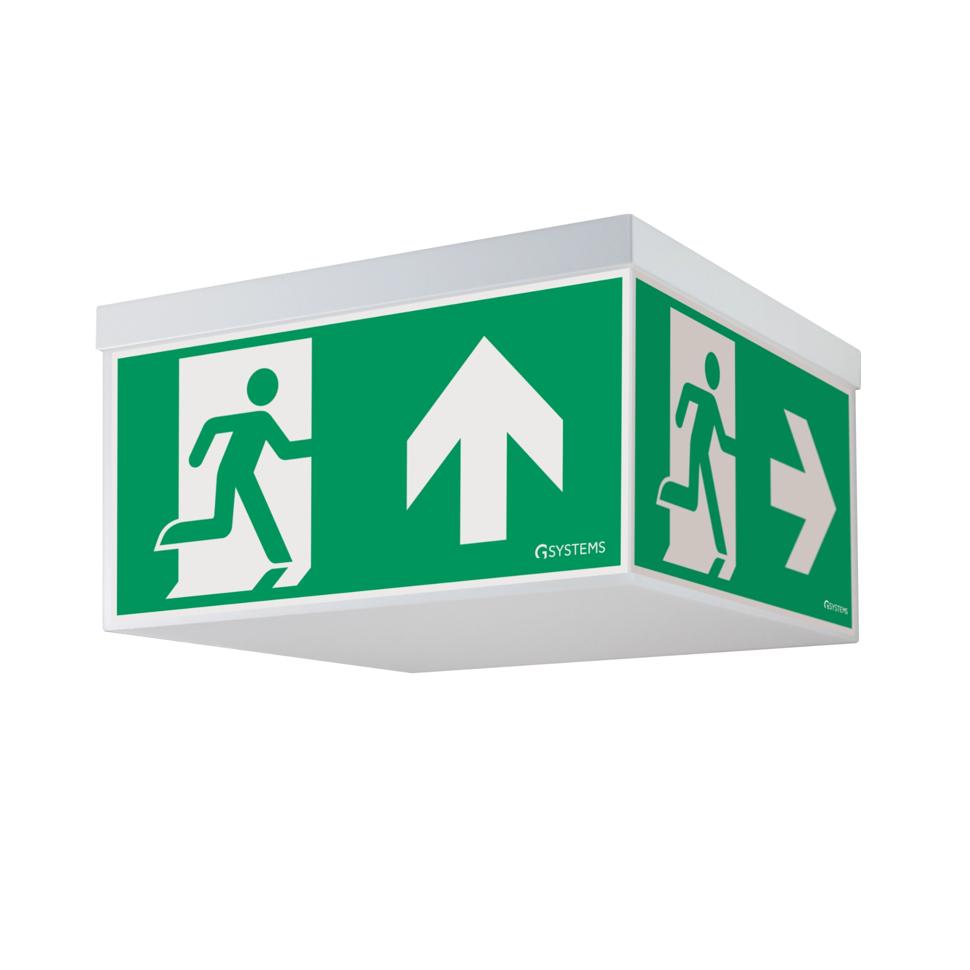 Die freihängende Positionierung im Raum ermöglicht eine klare Fluchtwegkennzeichnung auch in Bereichen, in denen Wandmontage nicht sinnvoll ist. Gleichzeitig sorgt die klare geometrische Bauform dafür, dass sich die Leuchte unauffällig in unterschiedliche architektonische Konzepte integrieren lässt.