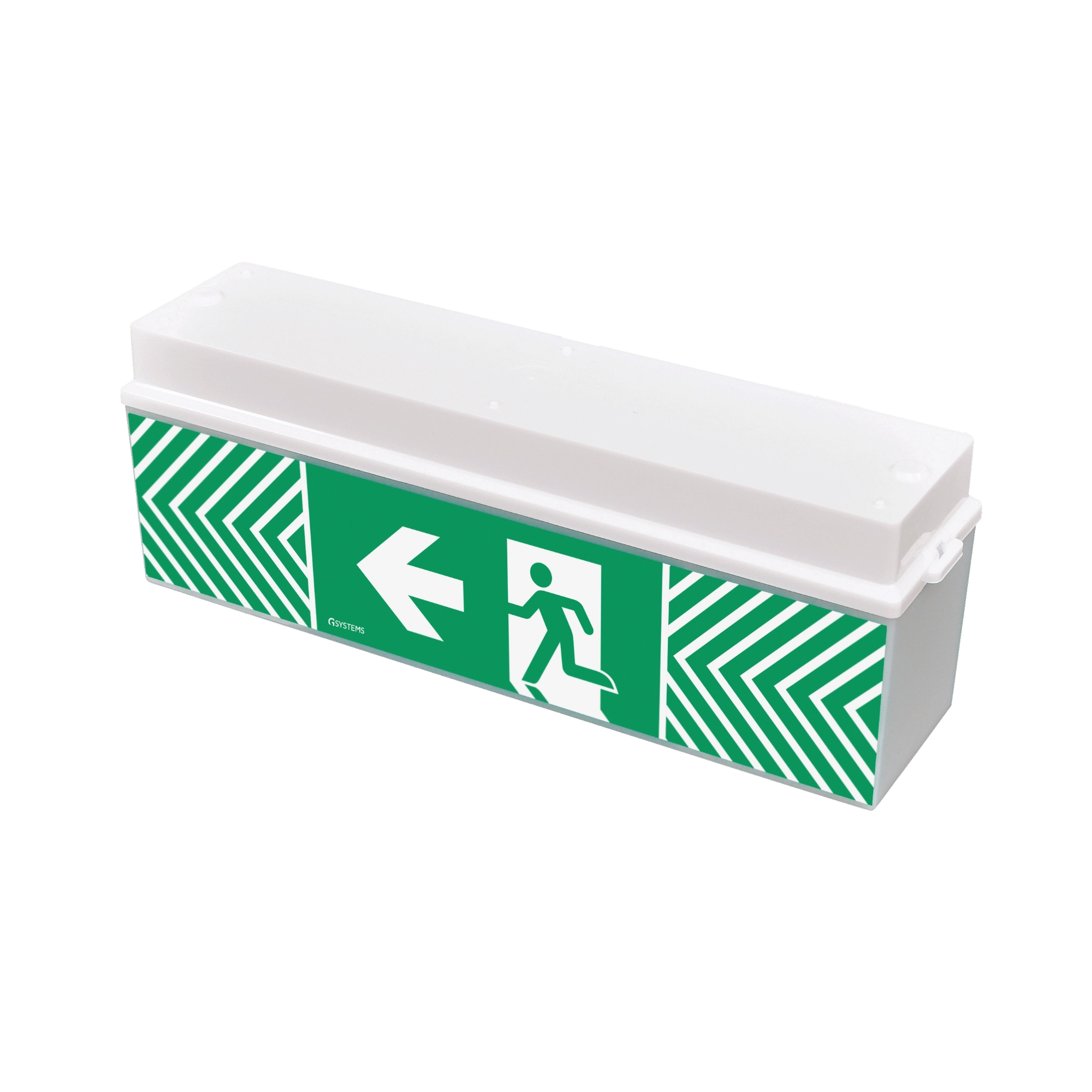 Exit sign luminaire for escape route marking in buildings, suitable for wall or ceiling mounting. Panel luminaire with acrylic glass panel for displaying exit signs and sheet steel housing. Pictogram set included for adapting the escape direction within the building.