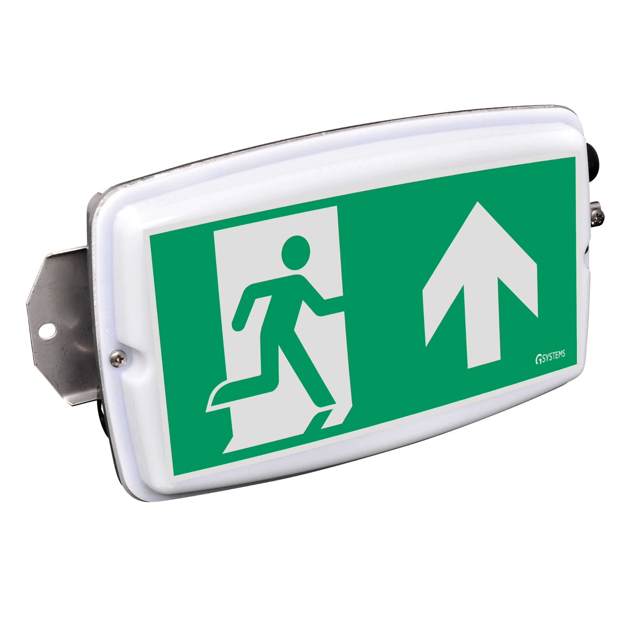 Exit sign luminaire for escape route marking with four-sided light emission for clear orientation in buildings. Ceiling installation with chain suspension set allows visible positioning within the space. Suitable for emergency lighting systems with central or self-contained battery supply.